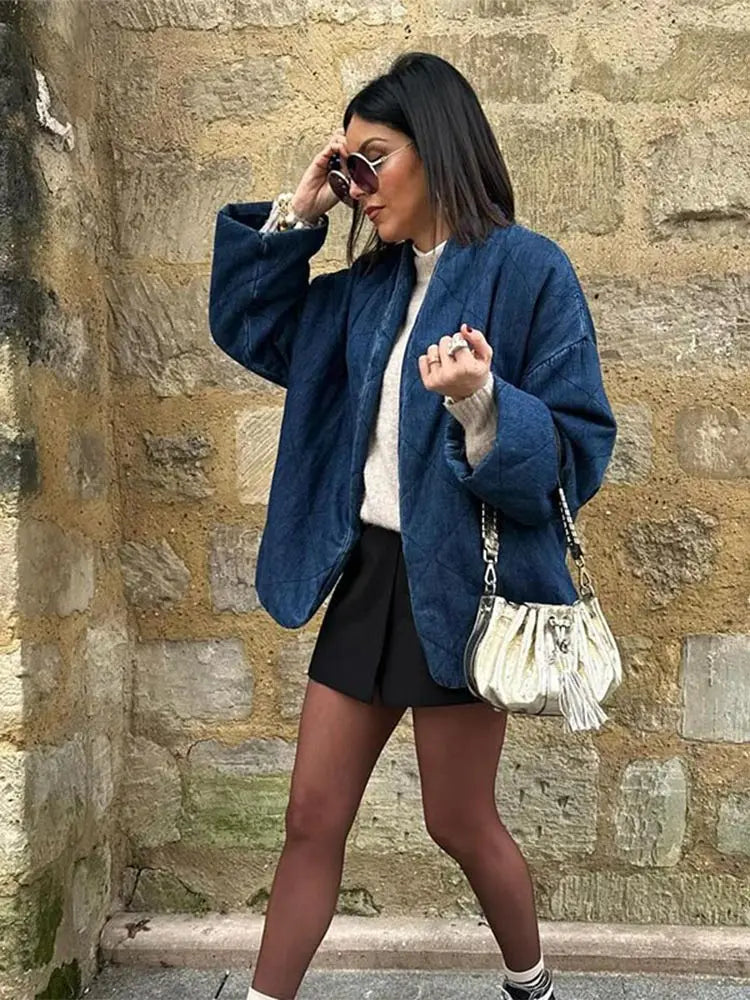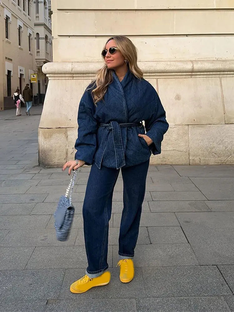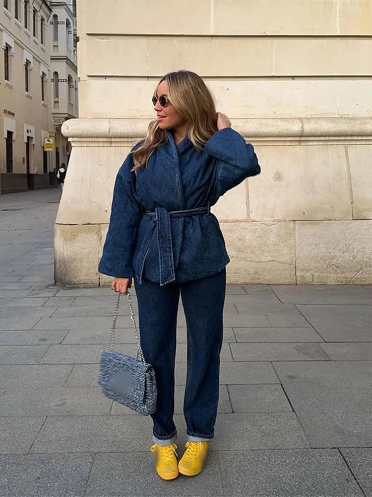 • Fashion-Forward Design: Modern denim coat with a chic collar and belt.
