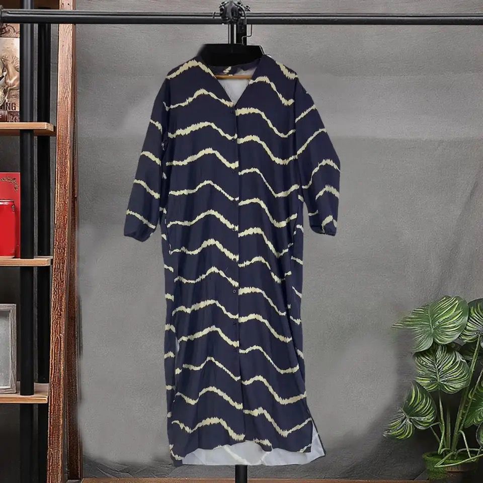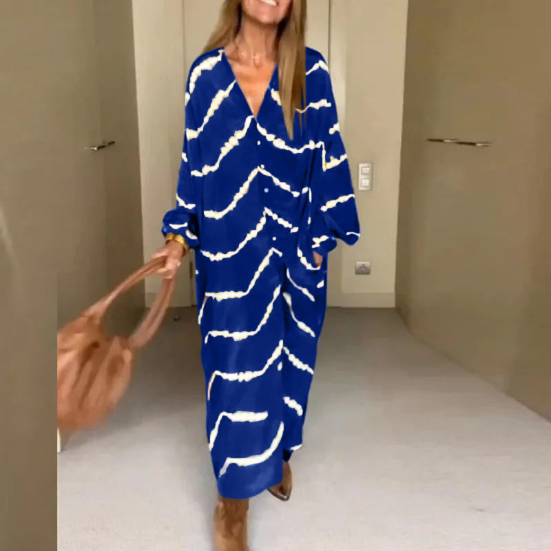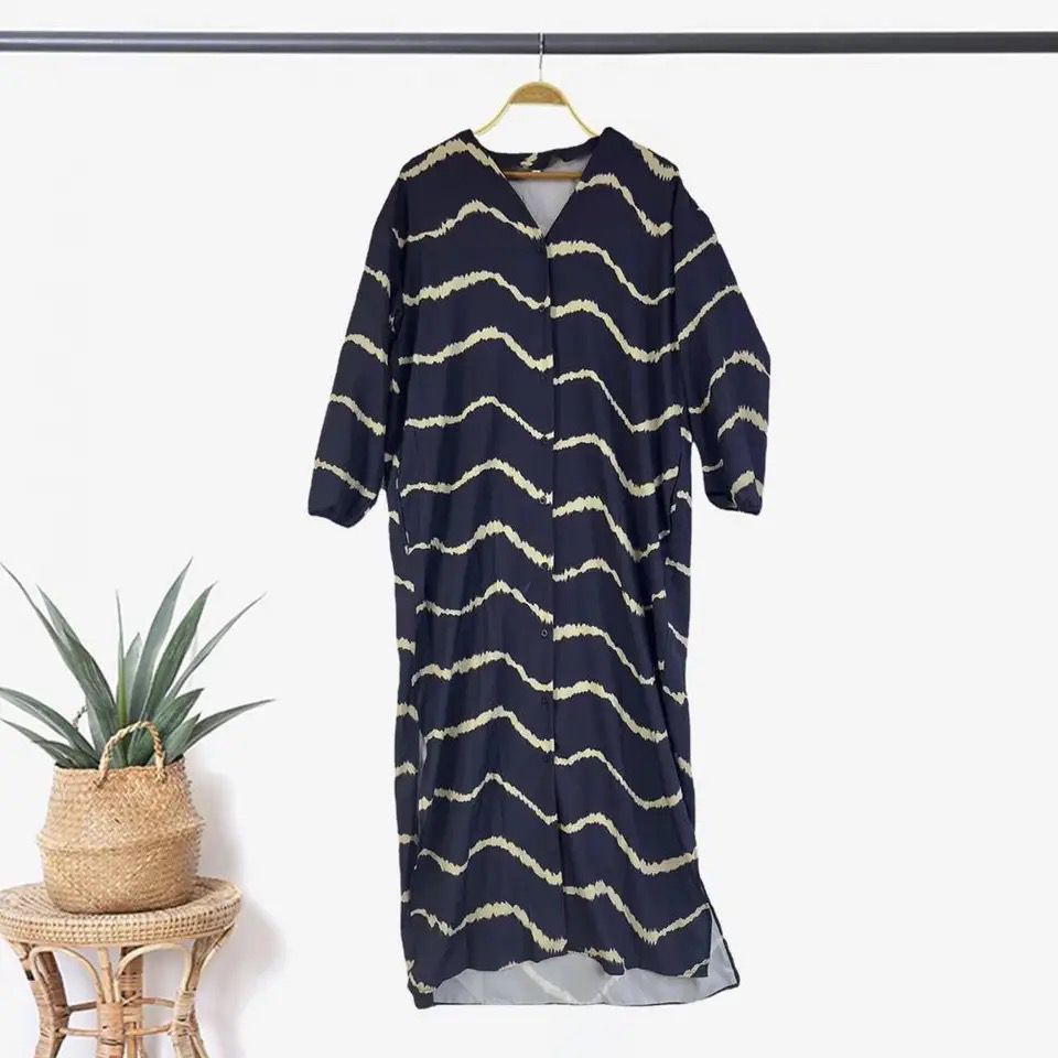Ļauj savam bohēmiskajam garam mirdzēt ar Luna™ garo piedurkņu svītraino kleitu. Šī kleita ir kas vairāk par modi – tā atspoguļo tavu piedzīvojumu pilno un atslābināto personību. Lieliski piemērota atvaļinājumiem, pludmales dienām vai ikdienišķām tikšanās reizēm, tās plūstošais dizains un košais raksts iemieso vasaras būtību. Izgatavota no augstas kvalitātes poliestera, tā sniedz komfortu un izturību, lai visu dienu izskatītos un justos lieliski. Tās klasiskā V-veida izgriezuma un elegantās pogu detaļas padara Luna™ svītraino kleitu par ideālu izvēli tiem, kuri vēlas ar pārliecību izcelt savu unikālo stilu.